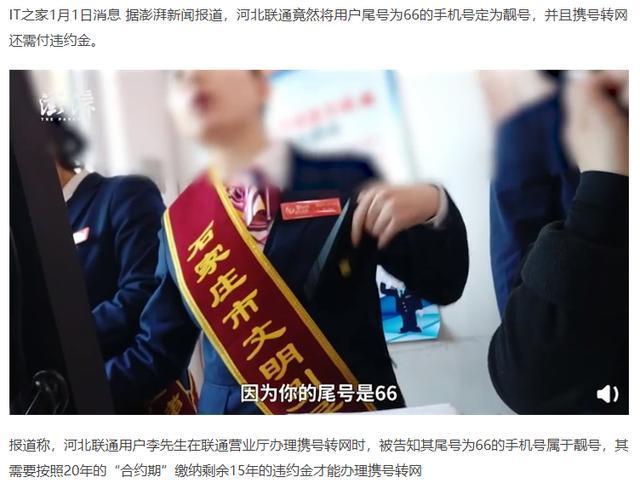 跨入5G时代,人们上手5G高速网络的同时,也积极办理被正式提上日程的携号转网服务。但今年刚刚开始,河北联通用户李先生就遇上了麻烦事。根据澎湃新闻报道,他在当地联通办公厅办理携号转网时,被告知其尾号为66的手机号属于靓号,其需要按照20年的“合约期”缴纳剩余15年的违约金才能办理携号转网。