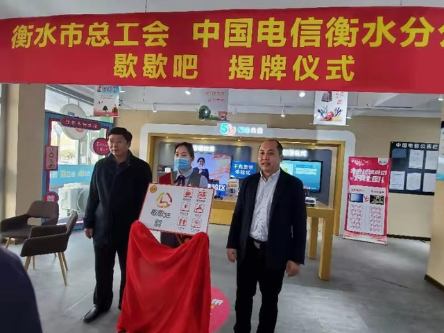 11月12日上午,衡水市总工会与中国电信衡水分公司联合举行衡水市电信公司歇歇吧揭牌仪式,这标志着衡水电信全市31个自由营业厅的“歇歇吧”开始向向环卫工人、快递小哥和外卖小哥等基层户外劳动者开放,提供热水、手机充电、卫生间、歇脚和热饭等服务。